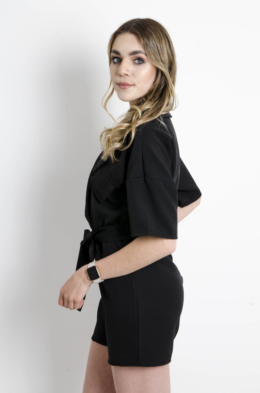KOMBINEZON ELEGANCKI WIĄZANY W PASIE - CZARNY