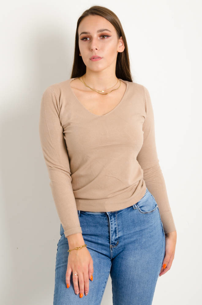 SWETER Z DEKOLTEM W SZPIC- BRĄZOWY
