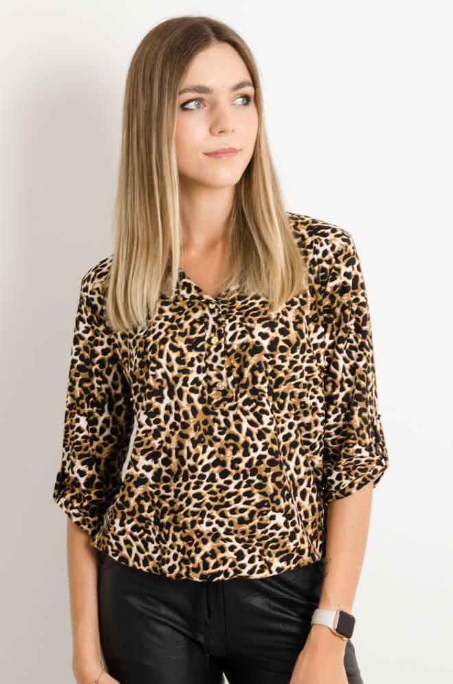BLUZKA W PANTERKĘ Z OZDOBNYMI GUZIKAM- BEŻOWA