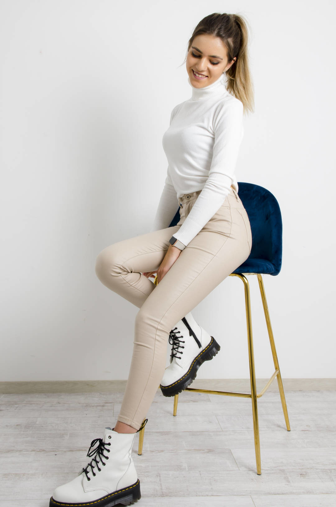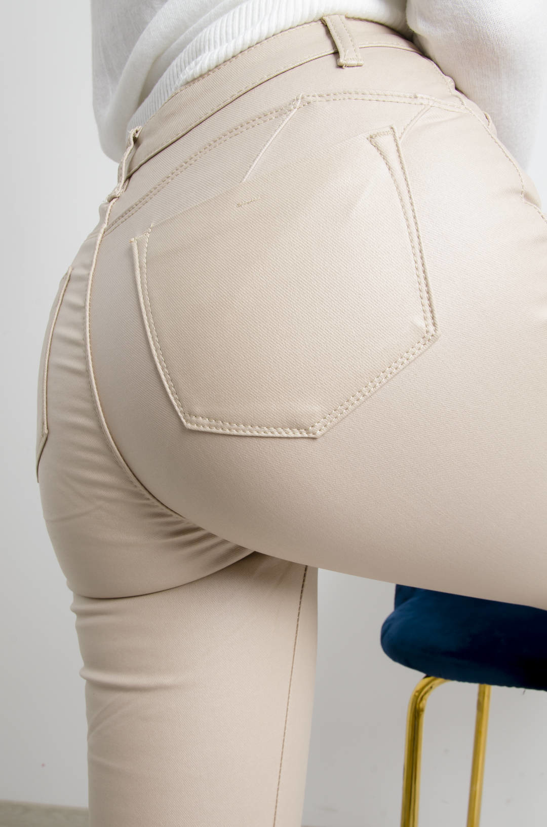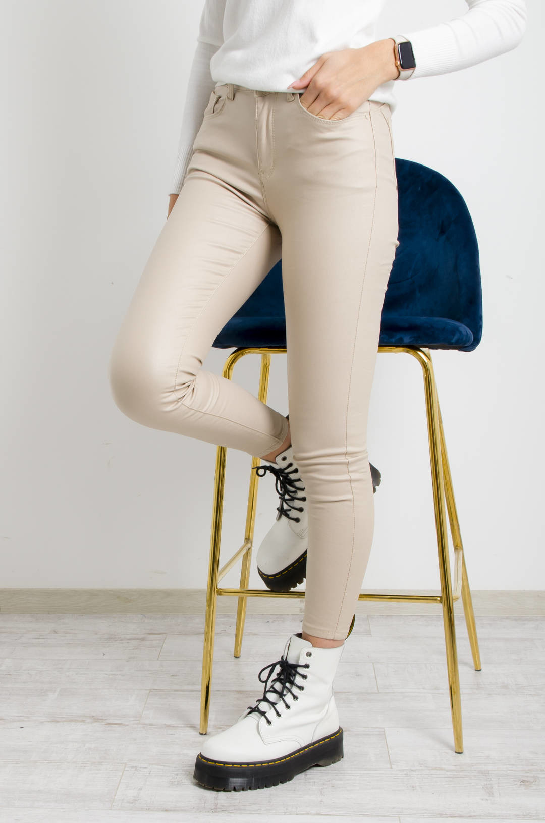 BEŻOWE WOSKOWANE SPODNIE Z WYSOKIM STANEM- OCIEPLANE