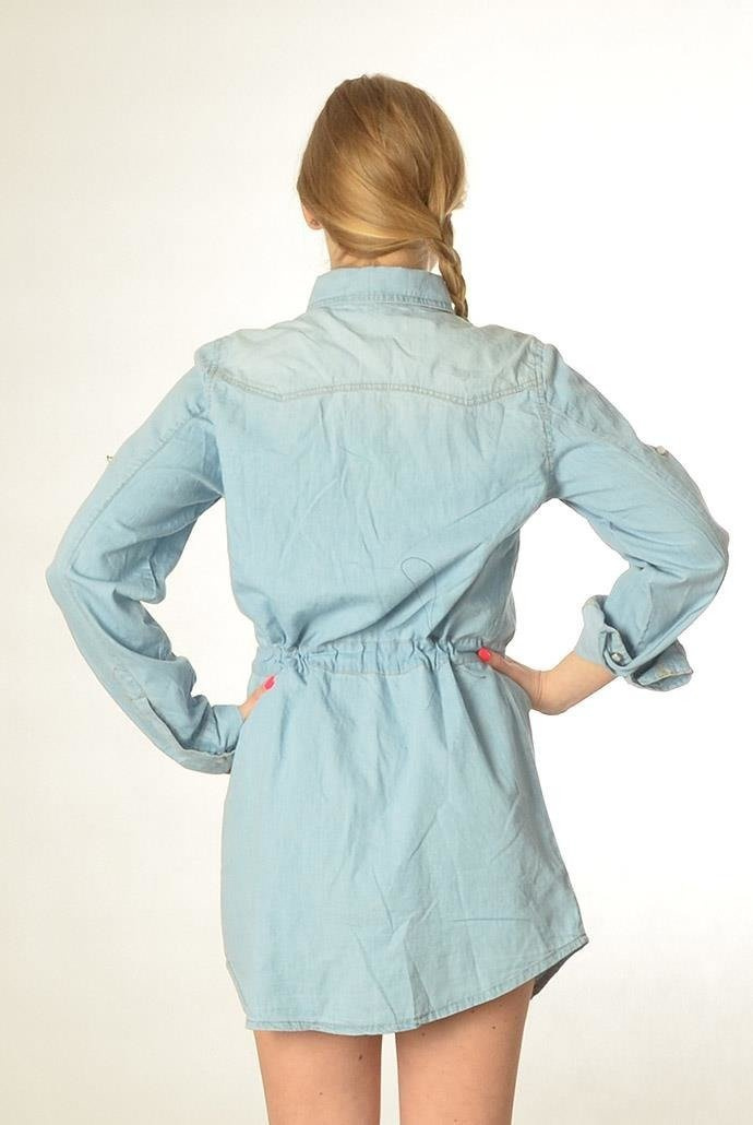 Koszula jeansowa ze sznurkiem zwężającym w talii. Przez swoje przedłużenie aż do ud świetnie nadaje się nie tylko na miasto, ale też na plażę.