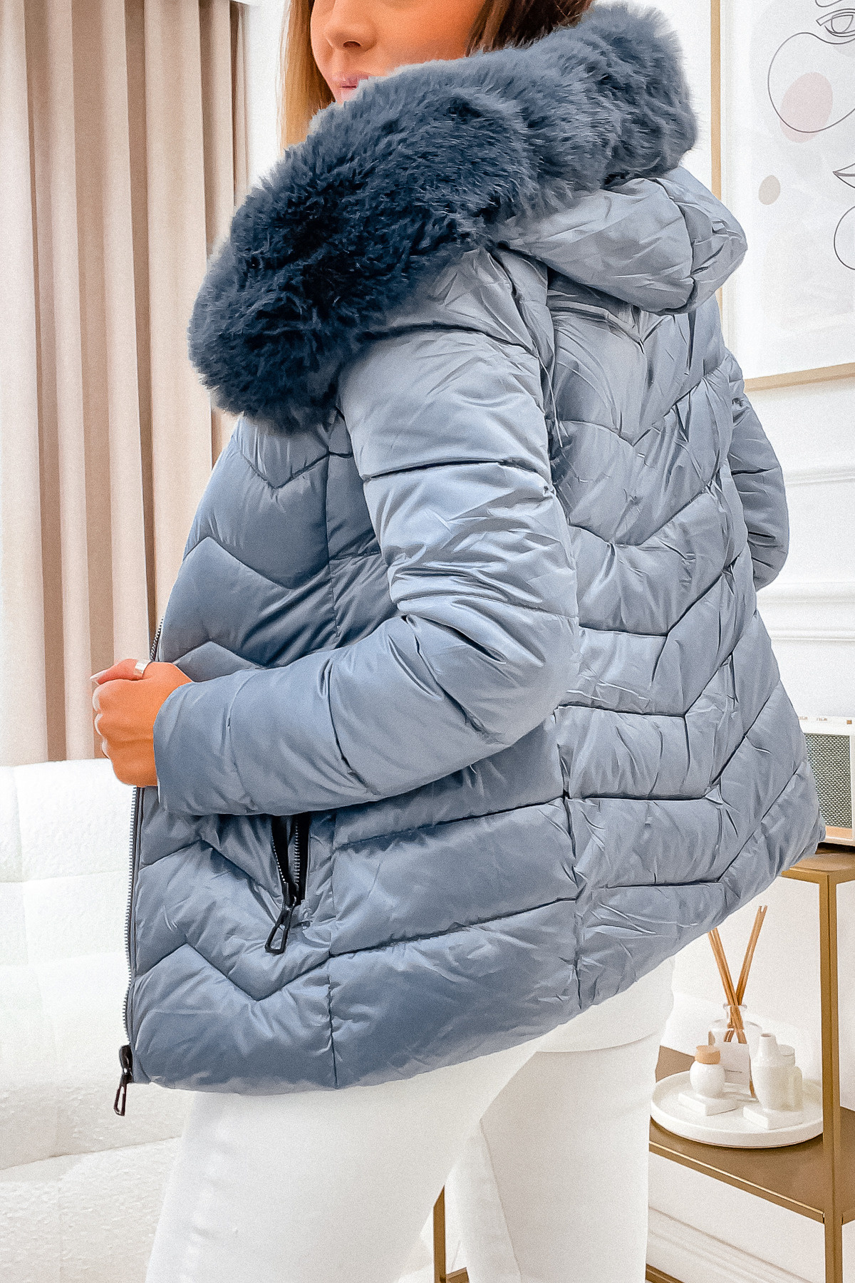 PIKOWANA POŁYSKUJĄCA KURTKA Z FUTERKIEM- SZARA