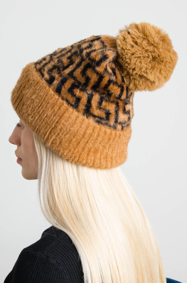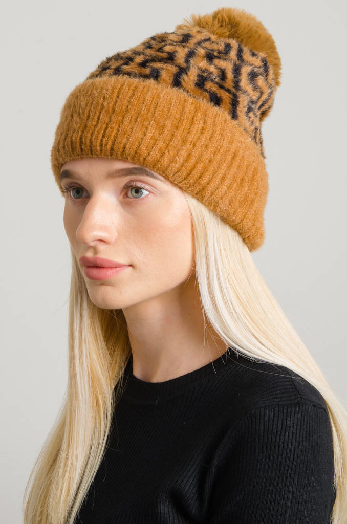 WZORZYSTA CZAPKA Z POMPONEM- BRĄZOWA