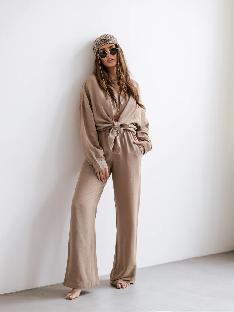 LNIANY KOMPLET KOSZULA+ SPODNIE- BRĄZOWY
