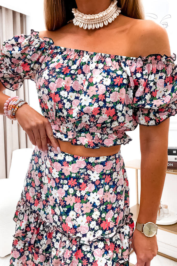 KOMPLET W KWIATOWY WZÓR SPÓDNICA+ BLUZKA HISZPANKA- CZARNY