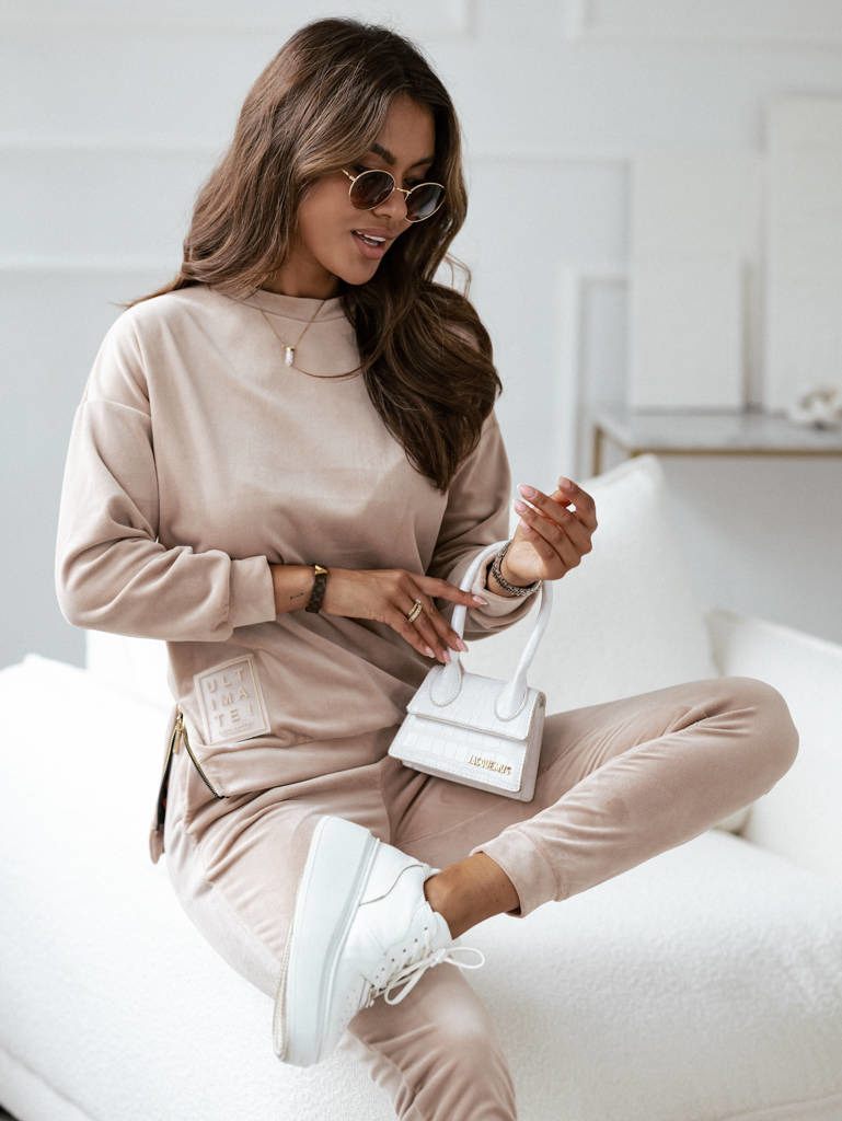 WELUROWY KOMPLET BLUZA Z ZAMKIEM I NASZYWKĄ + SPODNIE- BEŻOWY