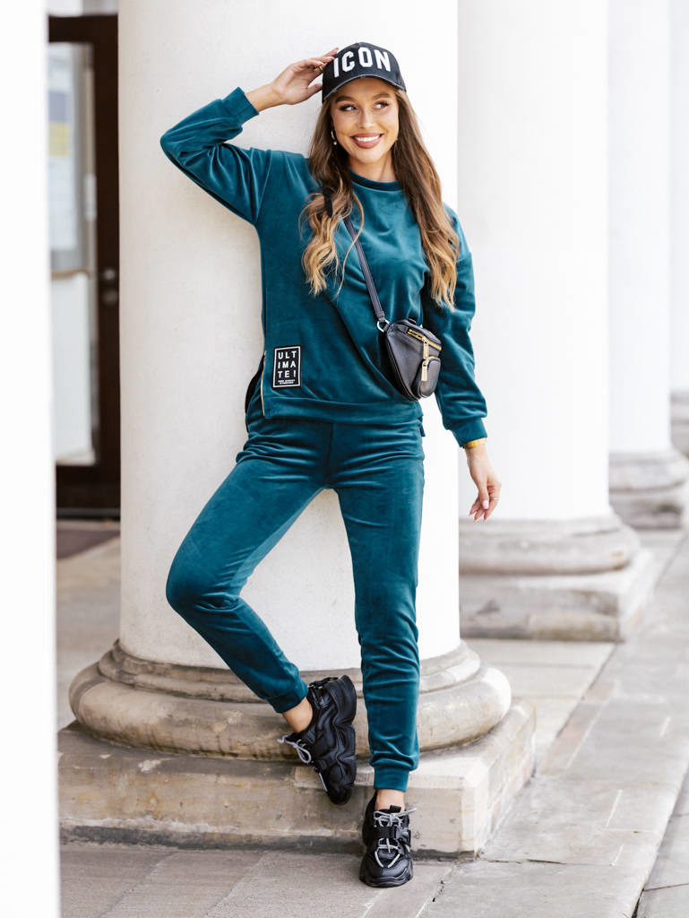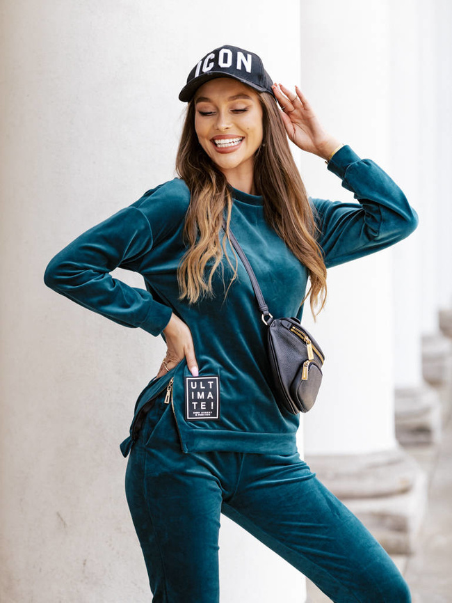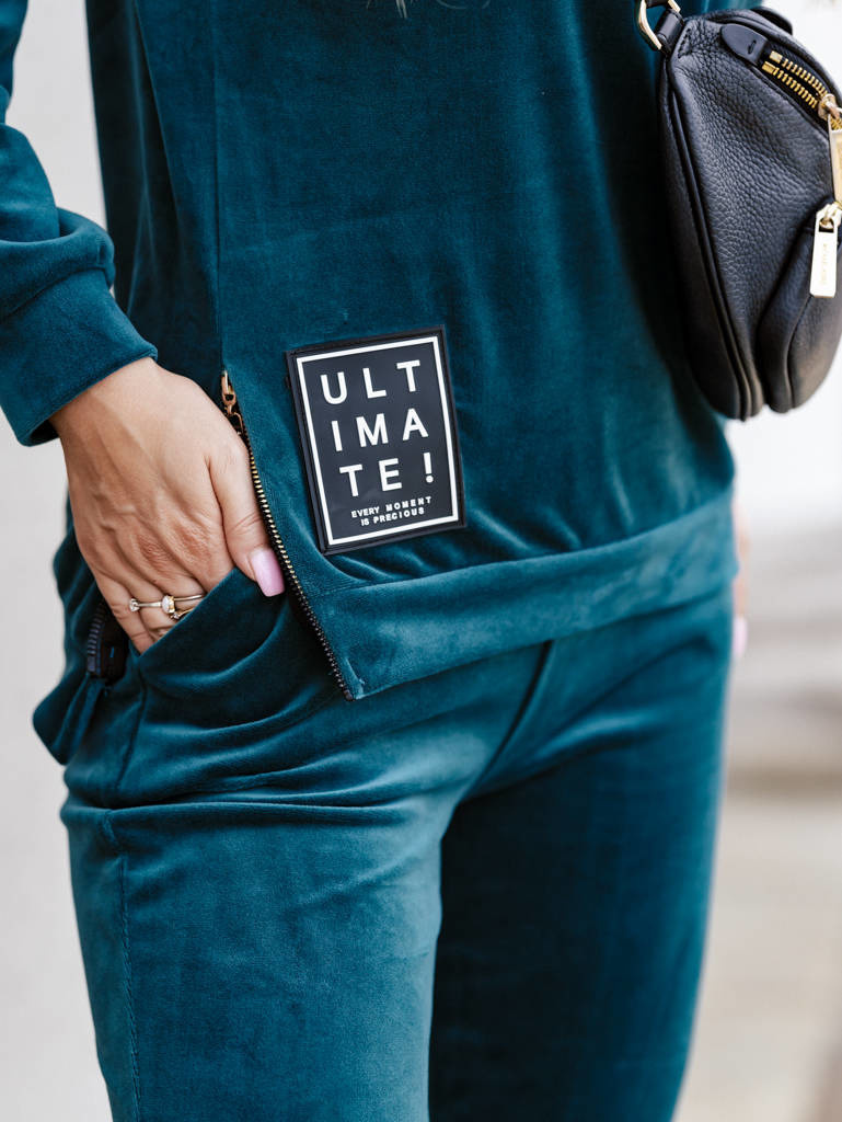 WELUROWY KOMPLET BLUZA Z ZAMKIEM I NASZYWKĄ + SPODNIE- BUTELKOWA ZIELEŃ