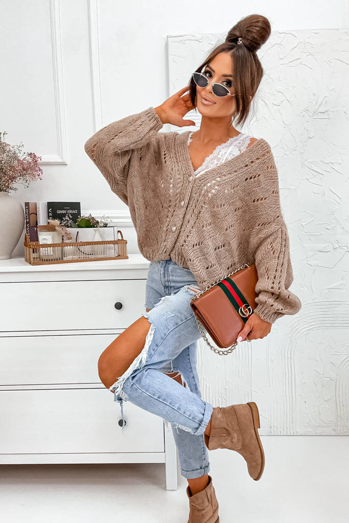LUŹNY SWETER ROZPINANY ZE ZŁOTYMI GUZIKAMI- BRĄZOWY