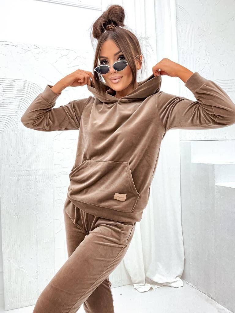 WELUROWY KOMPLET DRESOWY SPODNIE+ BLUZA Z KAPTUREM- BRĄZOWY