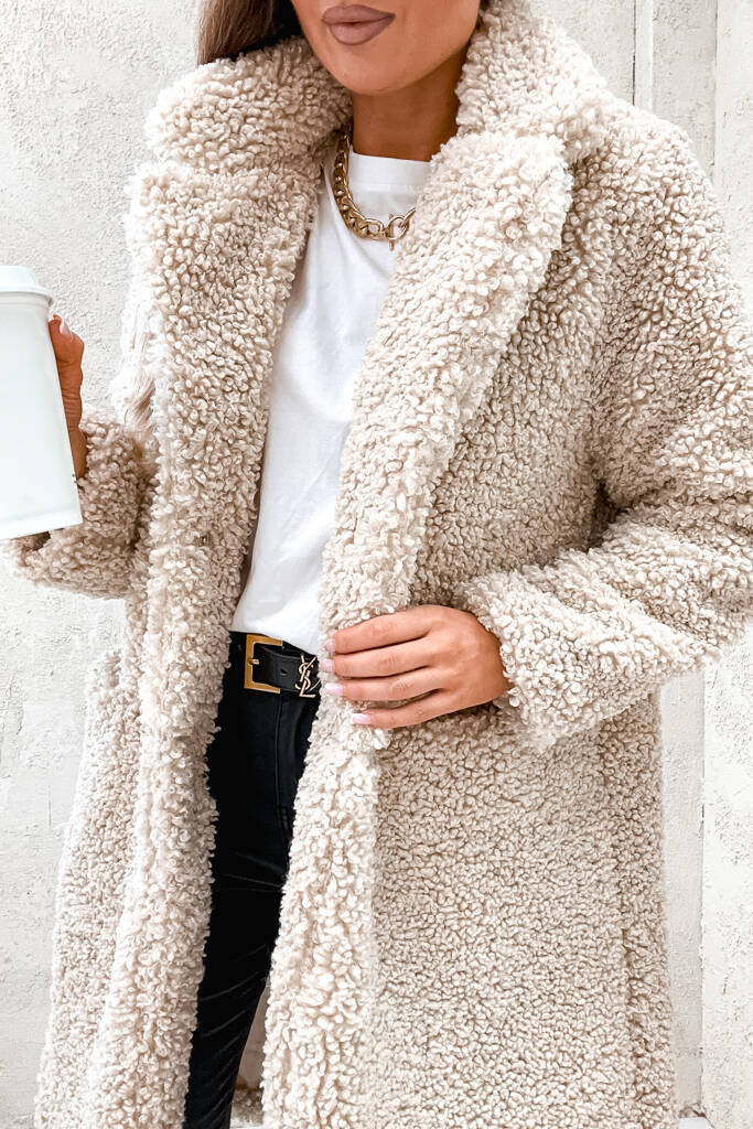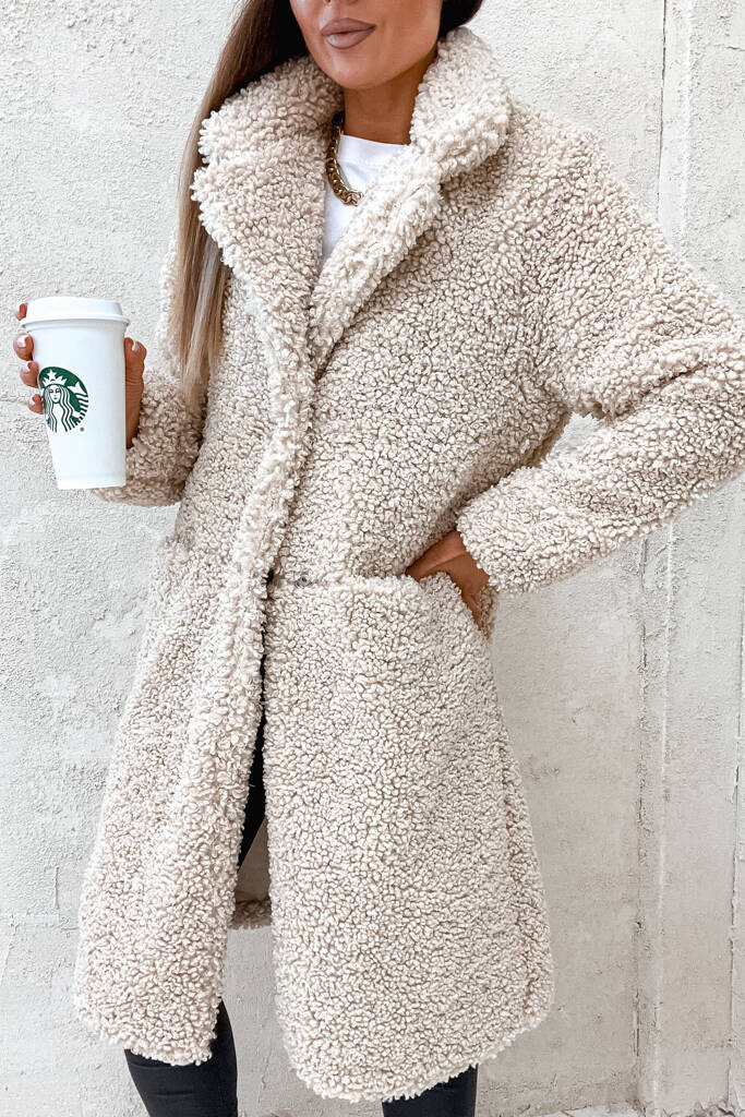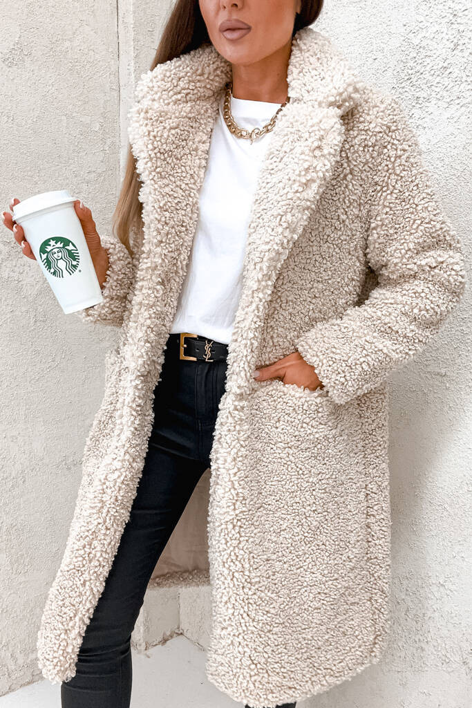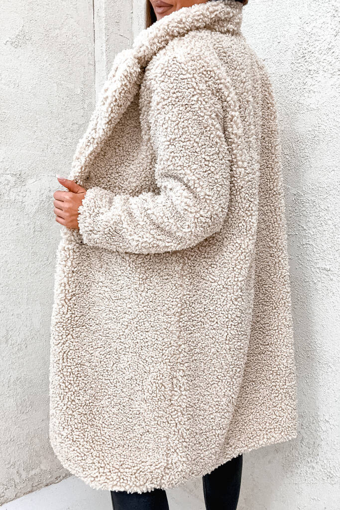 BEŻOWY PŁASZCZ OWIECZKA ZAPINANY NA ZATRZASKI