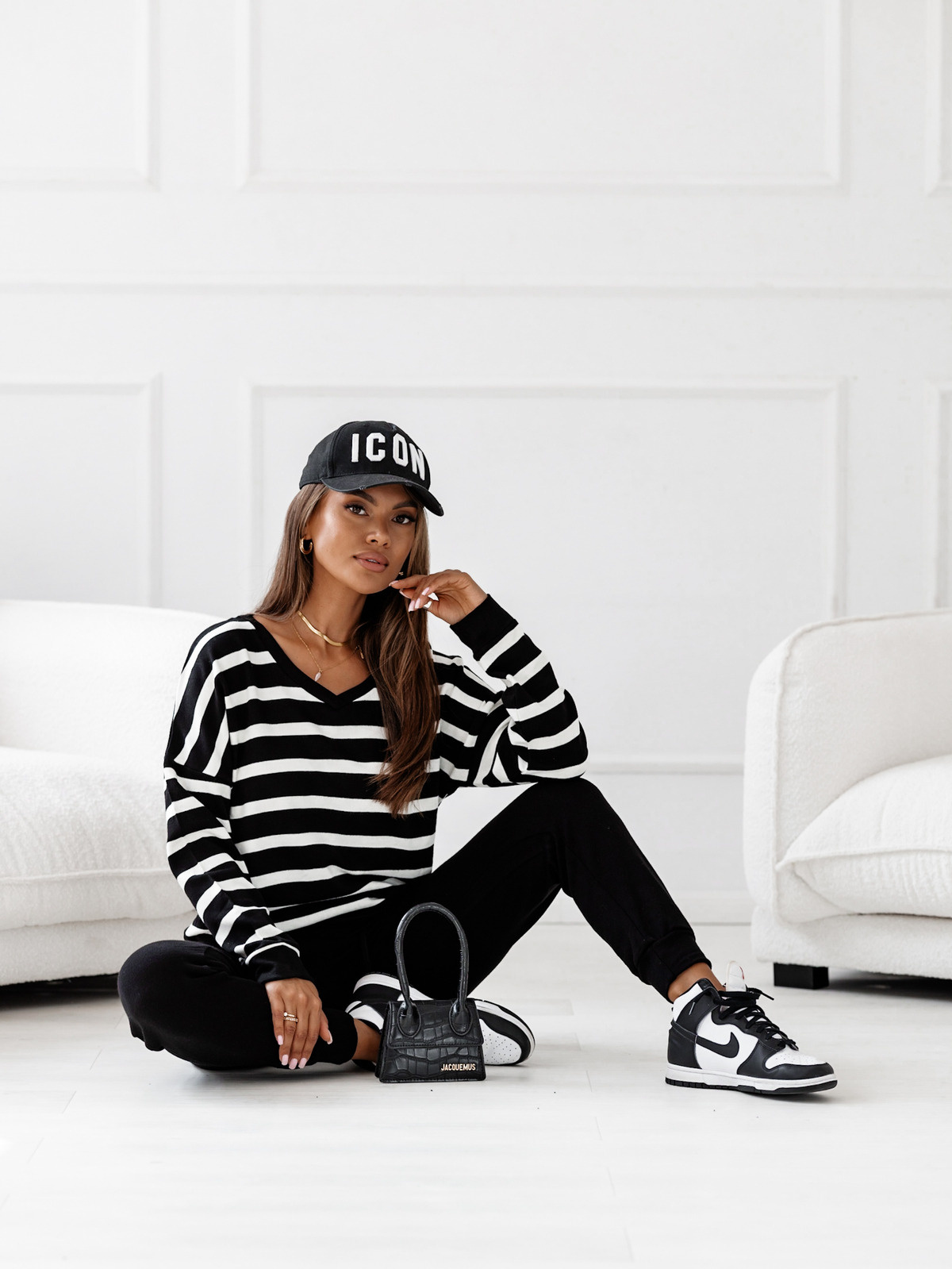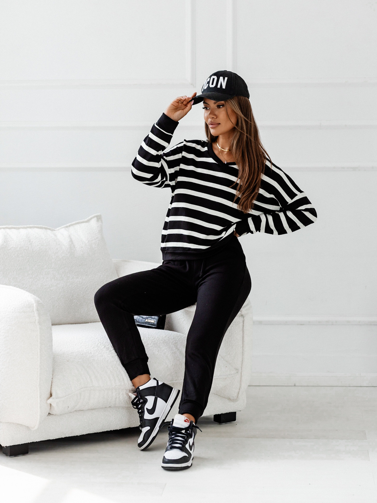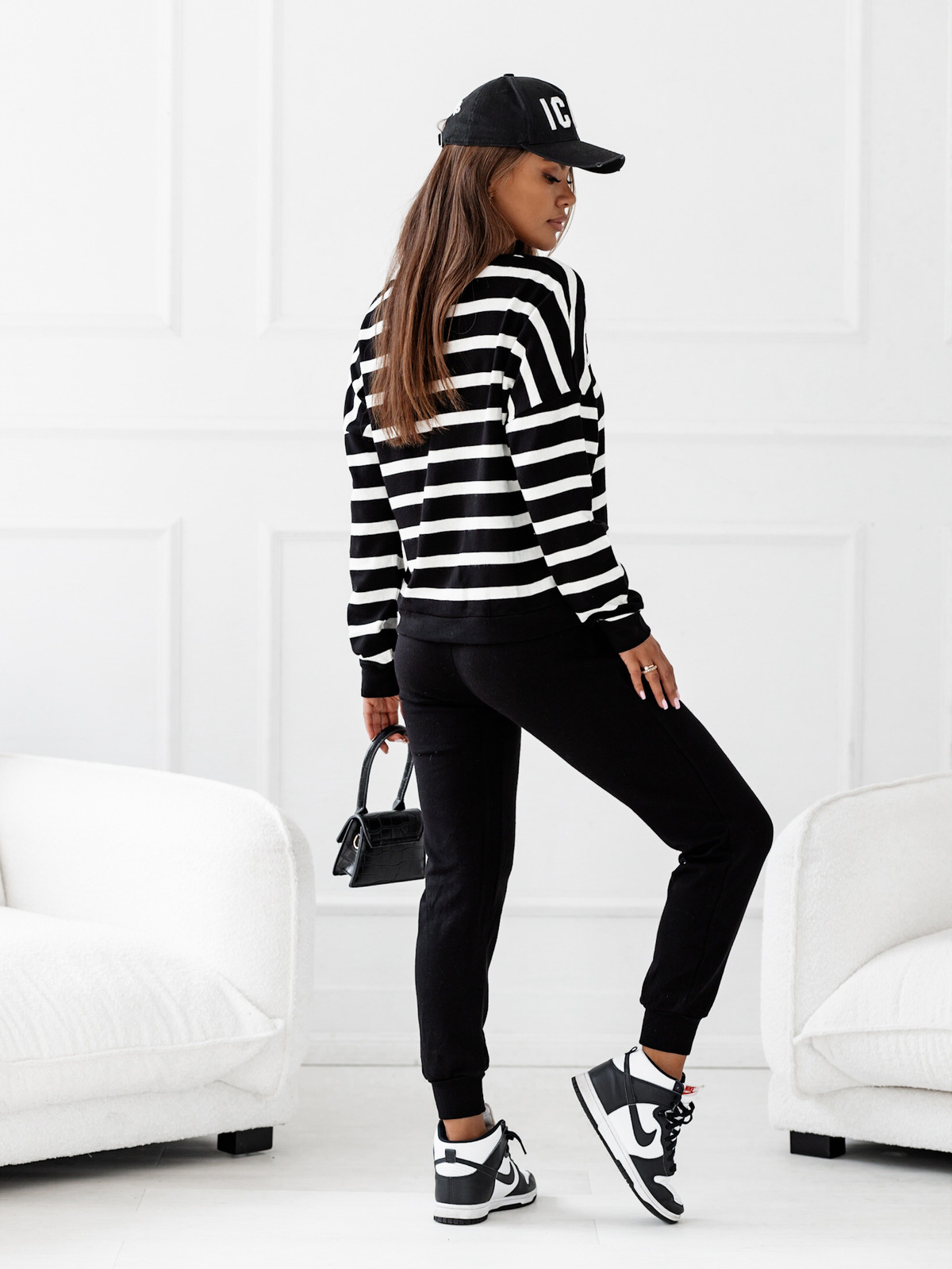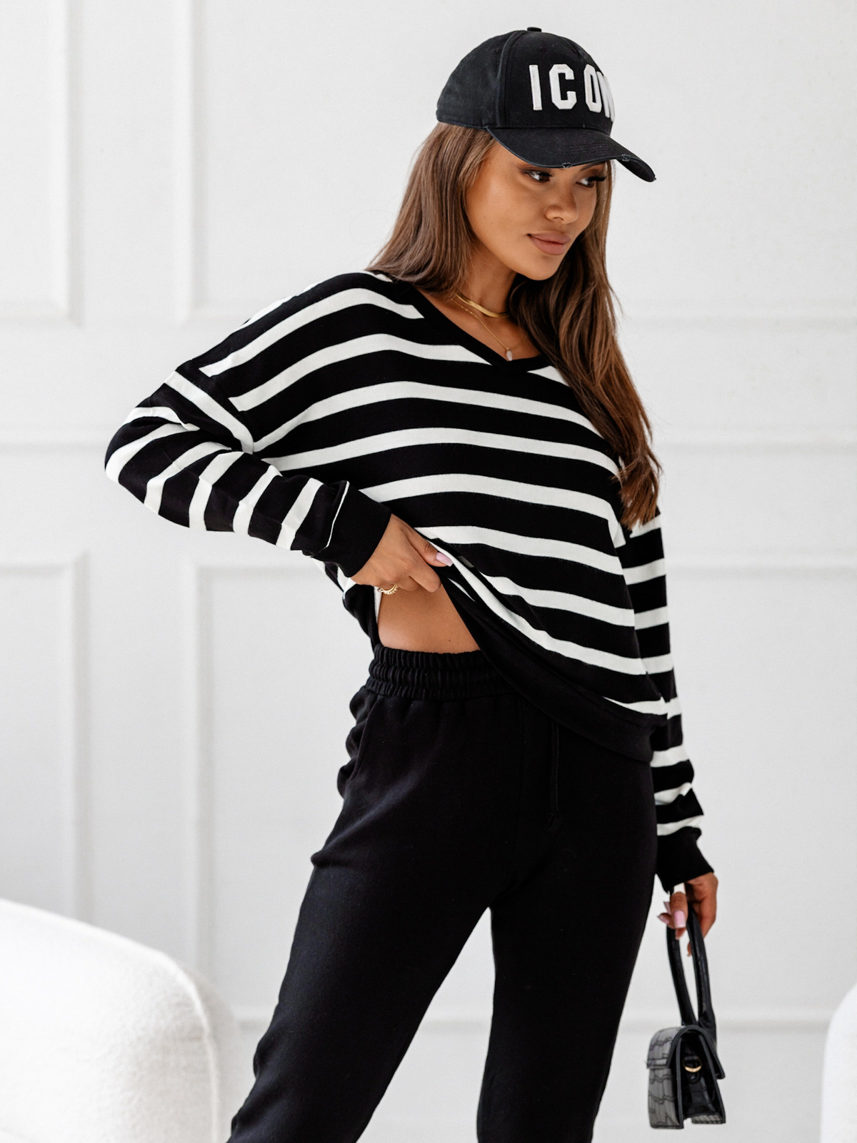 DZIANINOWY KOMPLET SPODNIE+ BLUZA W PASKI- CZARNY