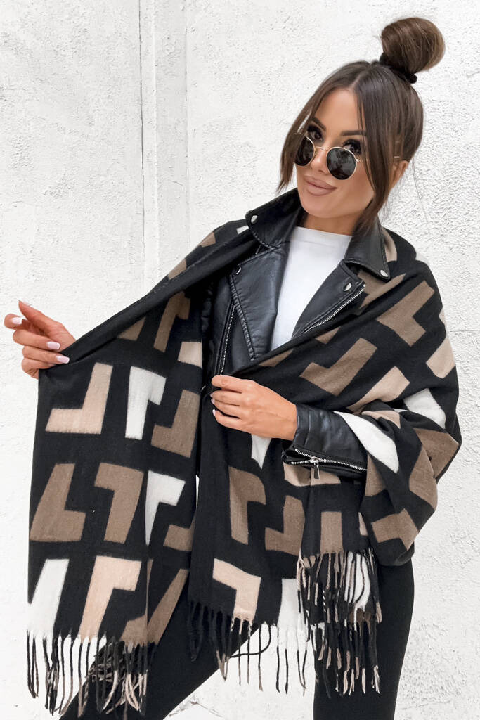 SZAL WZORZYSTY Z FRĘDZLAMI- CZARNY
