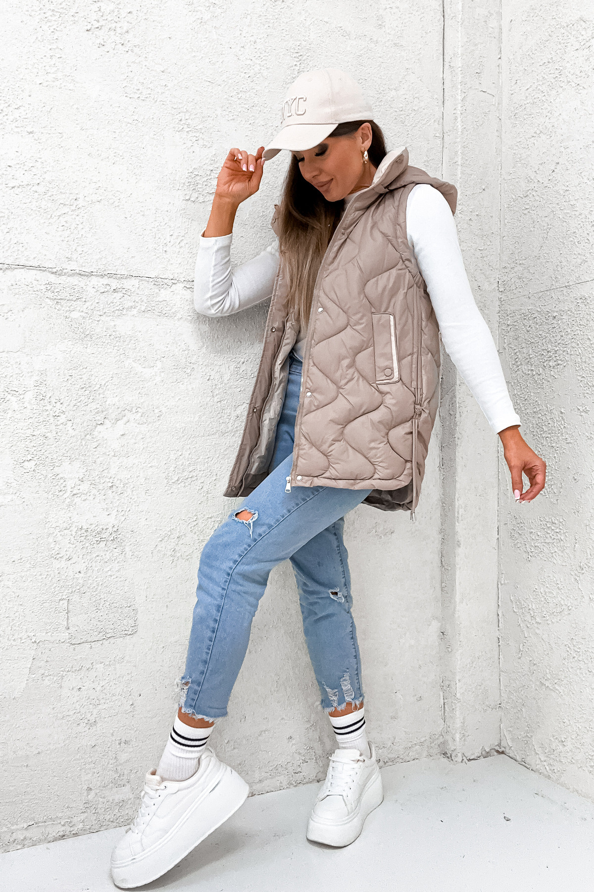 KAMIZELKA PIKOWANA Z KAPTUREM I ŚCIĄGACZAMI PO BOKACH- BRĄZOWA
