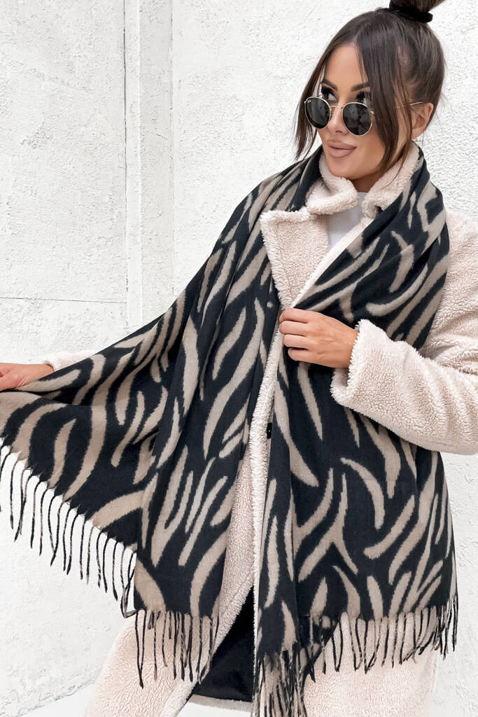 SZAL WE WZORY Z FRĘDZLAMI- BRĄZOWY