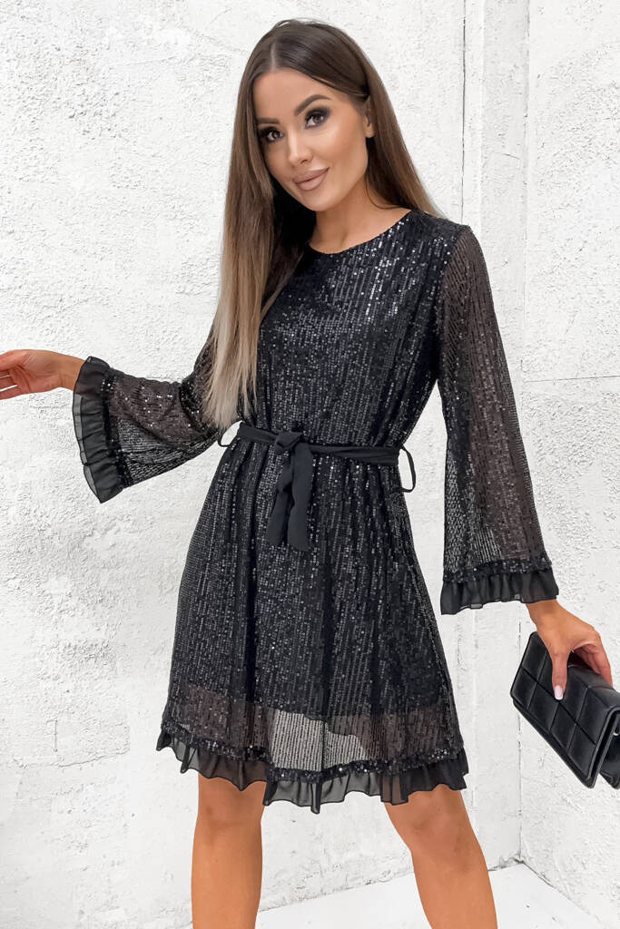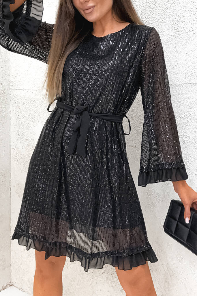 CZARNA SUKIENKA MINI W CEKINY Z FALBANKĄ I WIĄZANIEM W PASIE