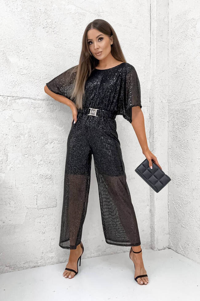 CZARNY ELEGNACKI KOMBINEZON W CEKINI Z OZDOBNYM PASKIEM