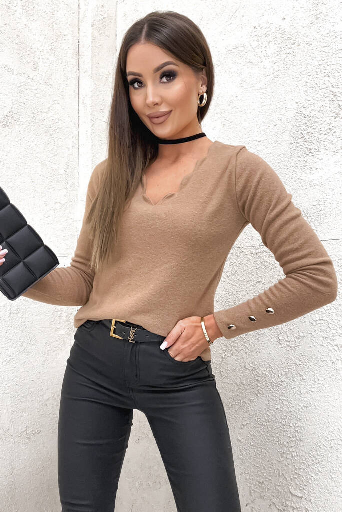 BRĄZOWA BLUZKA Z OZDOBNYM DEKOLTEM I GUZIKAMI