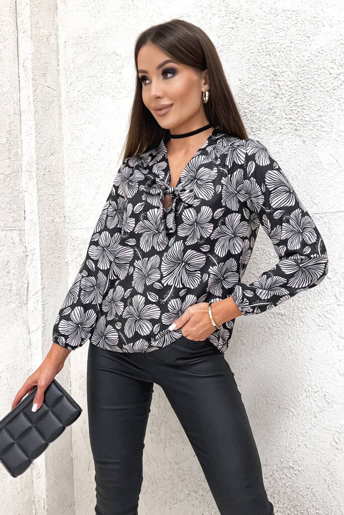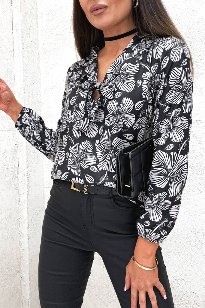 BLUZKA Z MOTYWEM KWIATOWYM WIAZANY DEKOLT W SEREK- CZARNA