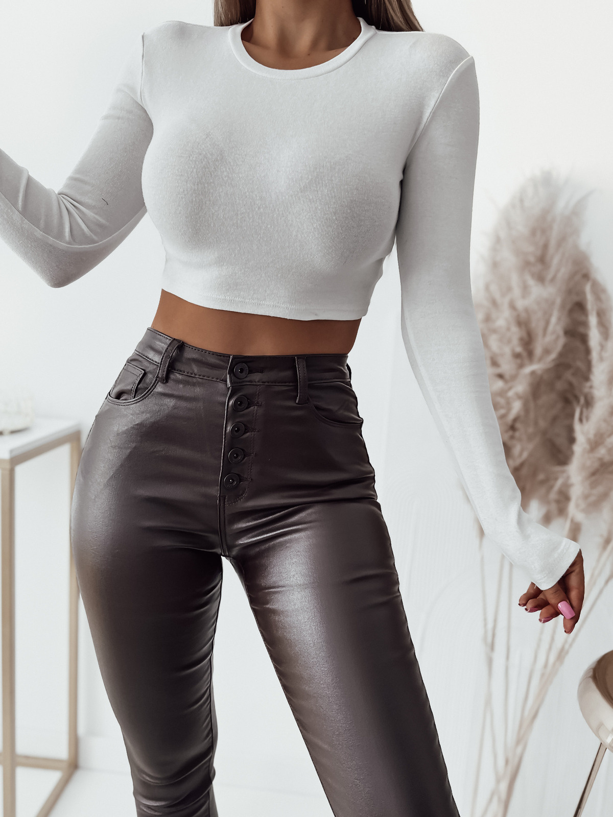 SPODNIE WOSKOWANE Z GUZIKAMI I WYSOKIM STANEM- CIEMNY BRĄZ