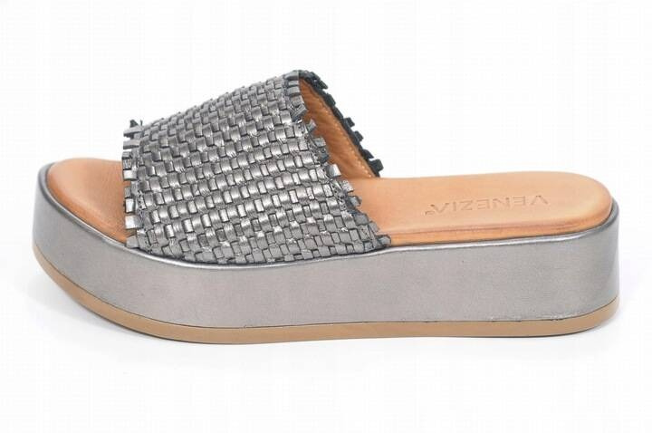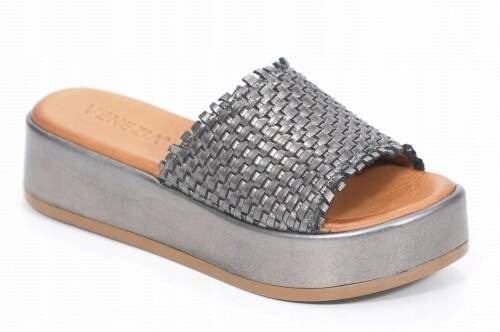 Srebrne klapki wykonane ze skóry cielęcej. Uwagę zwraca tłoczona aplikacja na cholewce. Niewysoki koturn powleczony połyskującą skórą delikatnie uniesie sylwetkę. Skórzana wkładka podbita miękką pianką świetnie sprawdzi się podczas codziennego użytkowania. Modne i wygodne będą doskonałym uzupełnieniem letnich stylizacji.