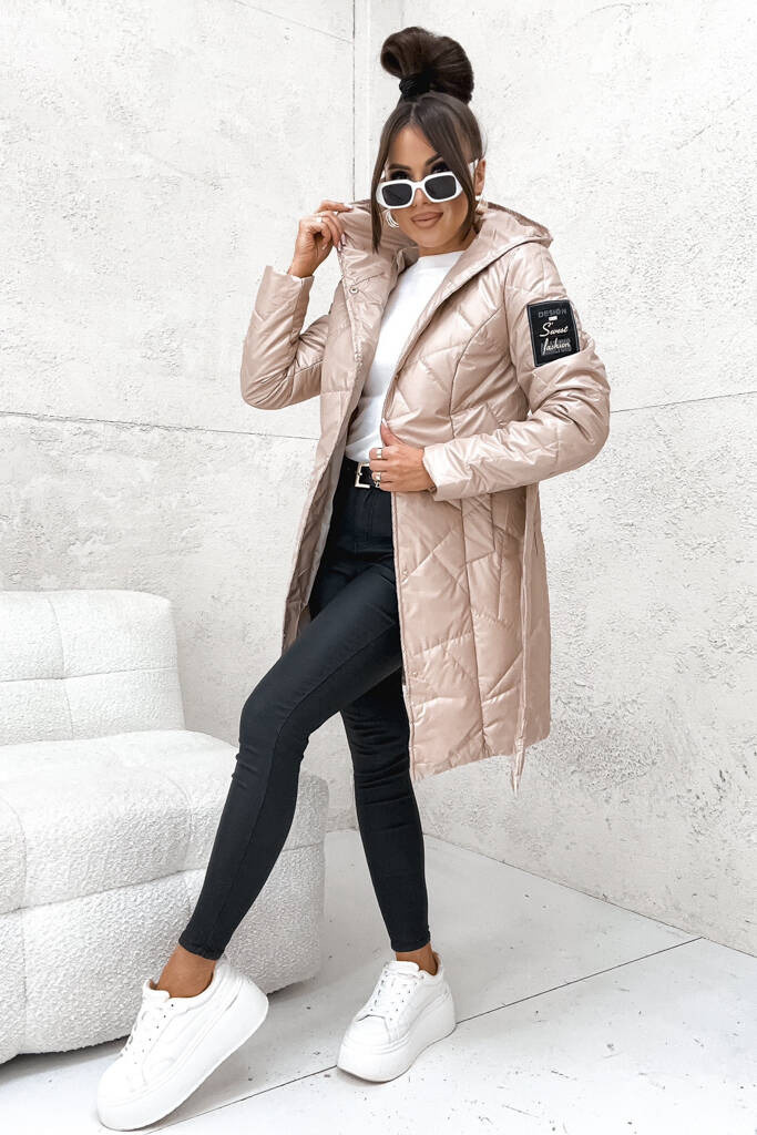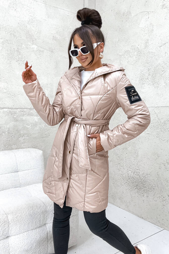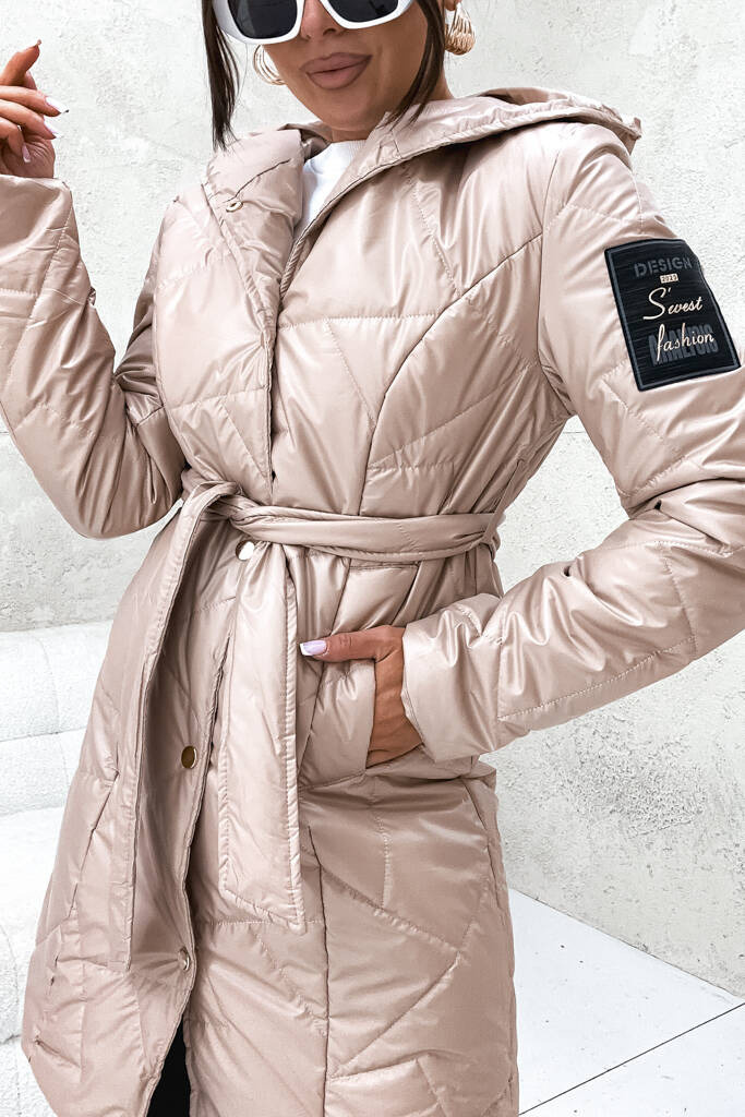 KURTKA PIKOWANA WIĄZANA W PASIE Z NASZYWKĄ NA RĘKAWIE- BEŻOWA