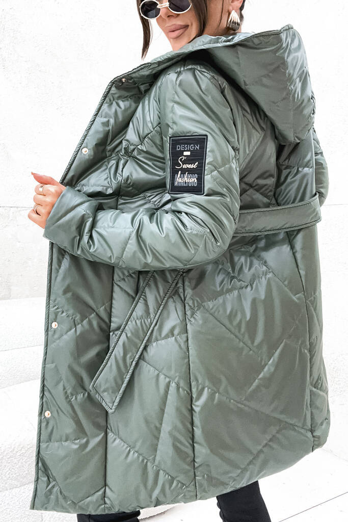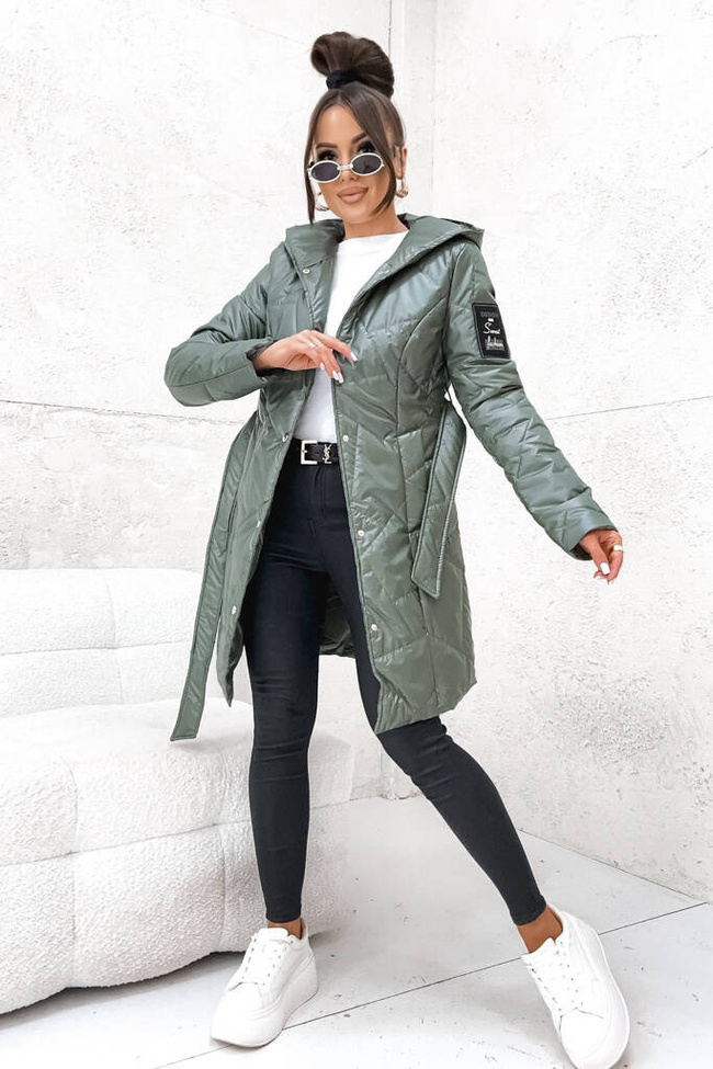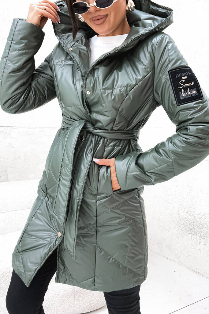 KURTKA PIKOWANA WIĄZANA W PASIE Z NASZYWKĄ NA RĘKAWIE- ZIELONA