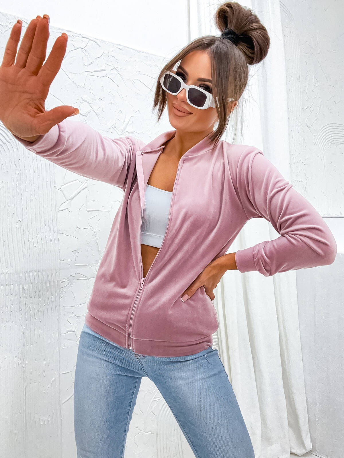 PUDROWA WELUROWA BLUZA ZAPINANA NA ZAMEK
