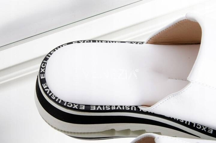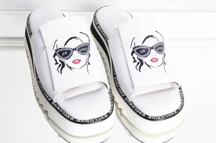 Białe klapki w nowoczesnym stylu zostały wykonane z bardzo dobrej jakości skóry naturalnej. Osadzone na niewysokim koturnie, ze skórzaną wkładką podbitą miękką gąbką, która maksymalnie podnosi komfort użytkowania. Cholewka z nowoczesnym, oryginalnym nadrukiem. Dekoracyjny otok ozdobiony napisami. Klapki świetnie sprawdzą się na co dzień.