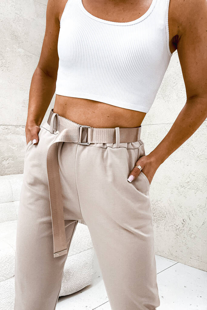 BEŻOWE SPODNIE Z KIESZENIAMI I ZŁOTYM PASKIEM