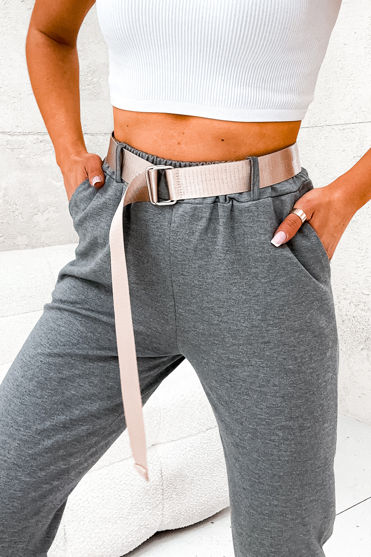 SZARE SPODNIE Z KIESZENIAMI I ZŁOTYM PASKIEM