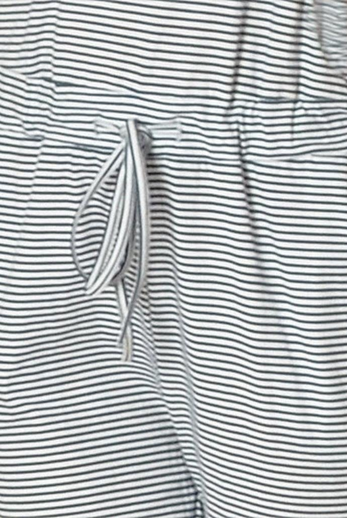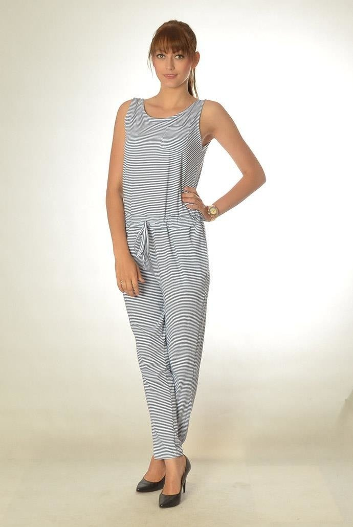 Kombinezon w paski wiązany sznurkiem w pasie. Świetny na letnie upały, ale też na zimniejsze dni gdy lato zaskoczy cię deszczem. Elegancki krój zapewni duży komfort noszenia.
