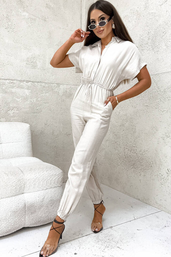 KOMBINEZON Z GUZIKAMI I GUMKĄ W PASIE- BEŻOWY