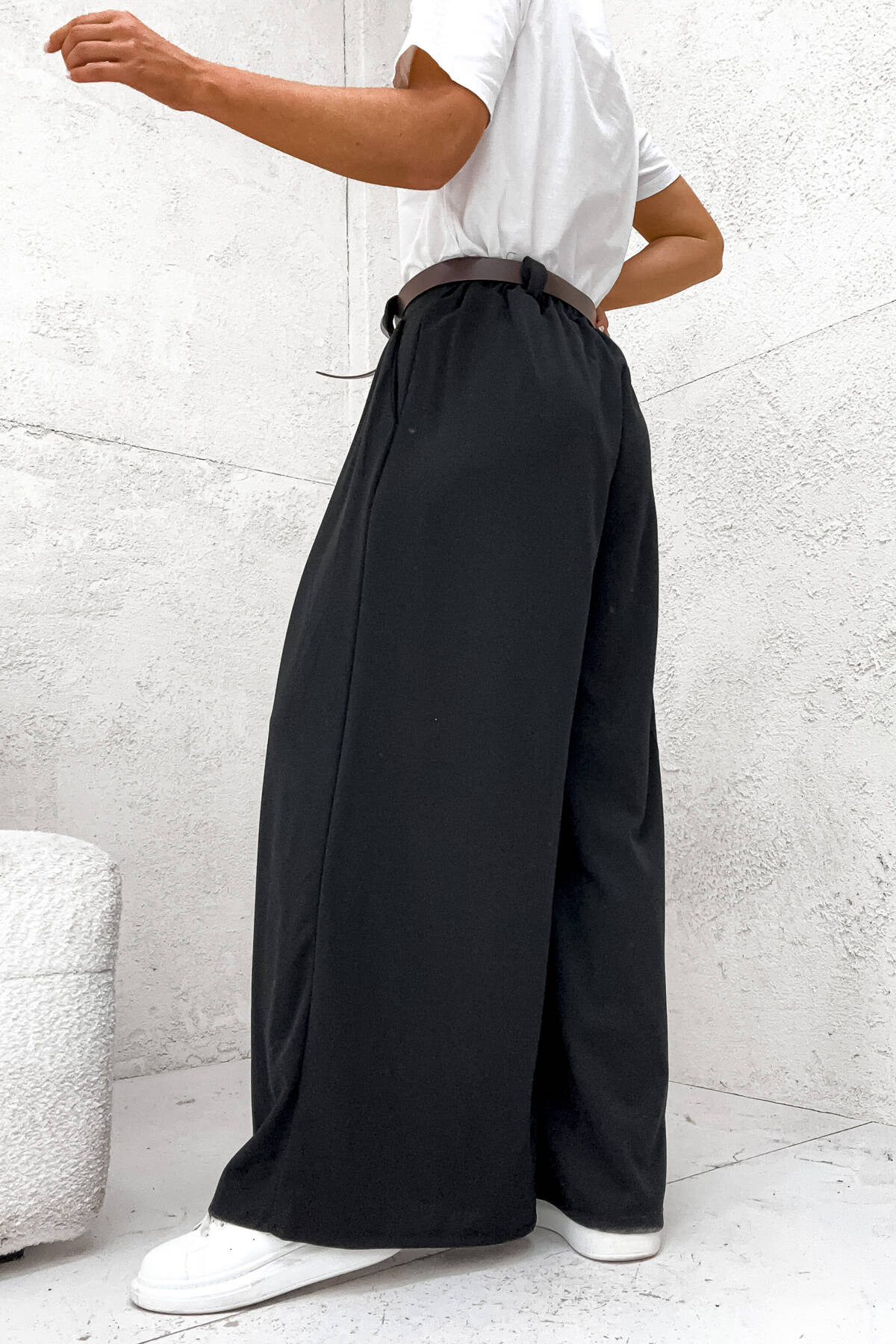 SZEROKIE SPODNIE ONESIZE Z WYSOKIM STANEM I PASKIEM- CZARNE