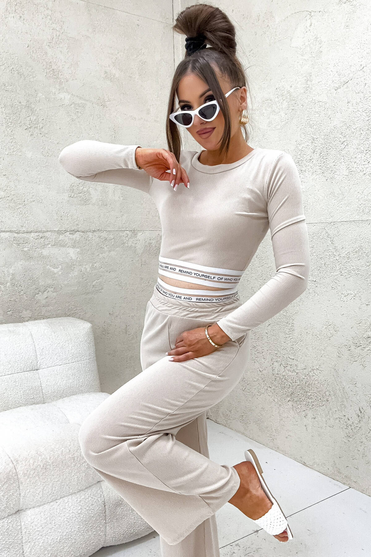 KOMPLET PRĄŻEK SZEROKIE SPODNIE+TOP- BEŻOWY
