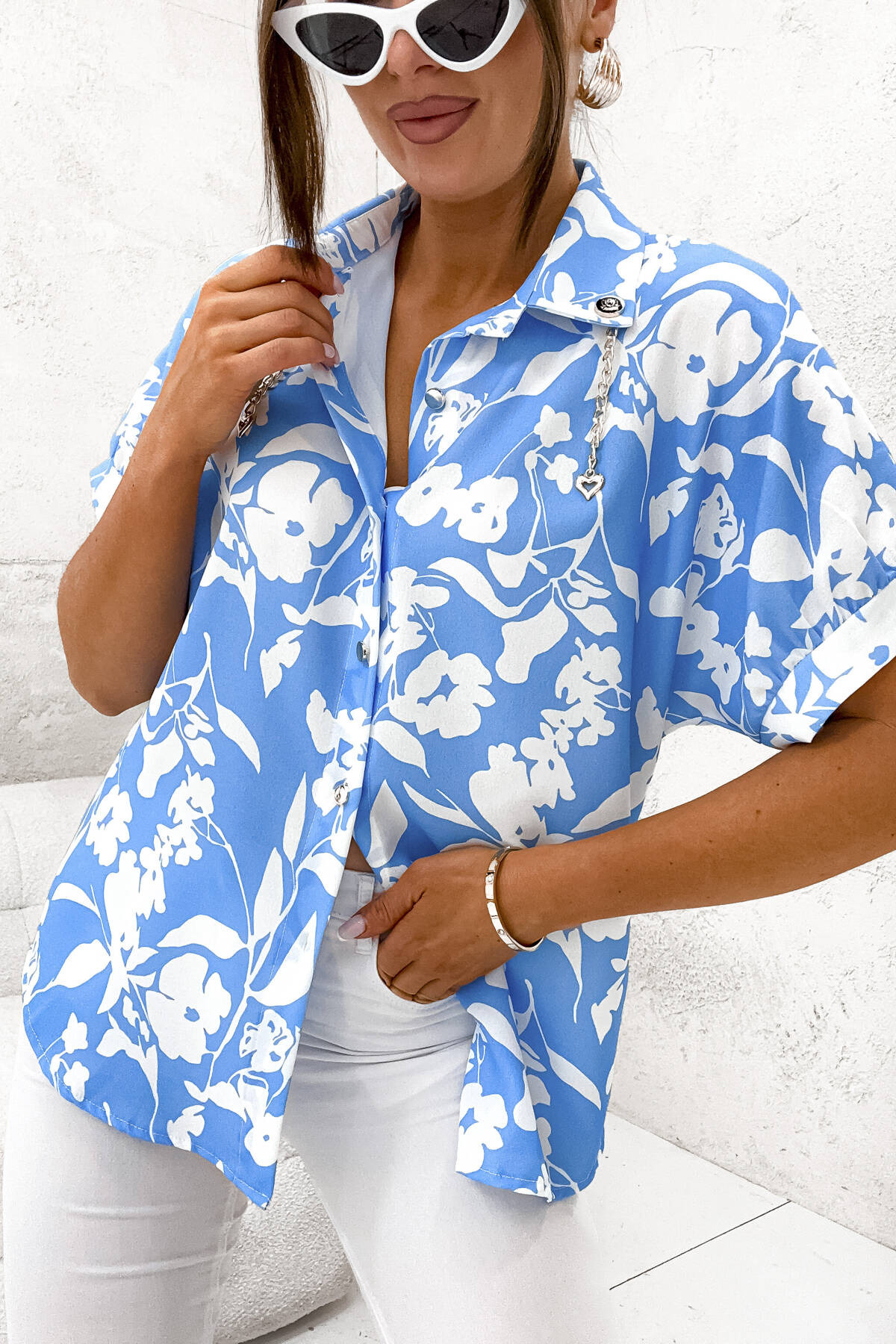 WZORZYSTA BLUZKA ZAPINANA NA GUZIKI Z ŁAŃCUSZKAMI-NIEBIESKA