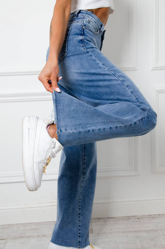 JASNE SPODNIE JEANSOWE Z SUROWYMI,SZEROKIMI NOGAWKAMI I WYSOKIM STANEM