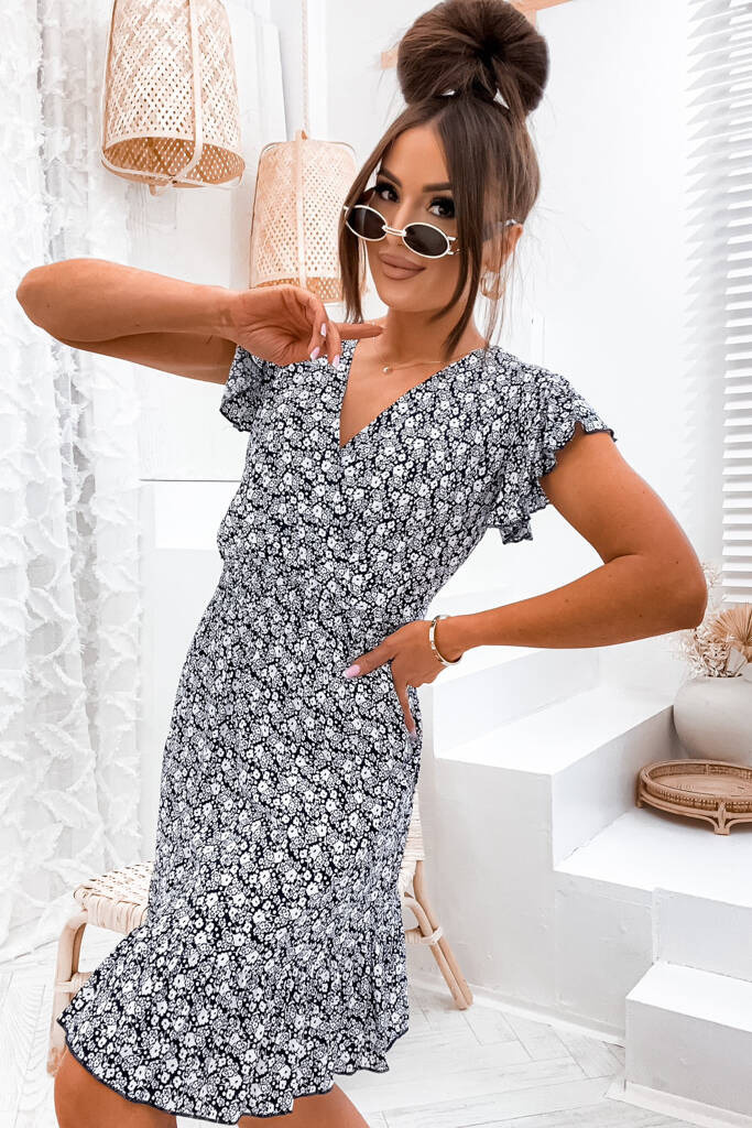 SUKIENKA MIDI W DROBNE KWIATY I GUMKĄ W PASIE-CZARNA