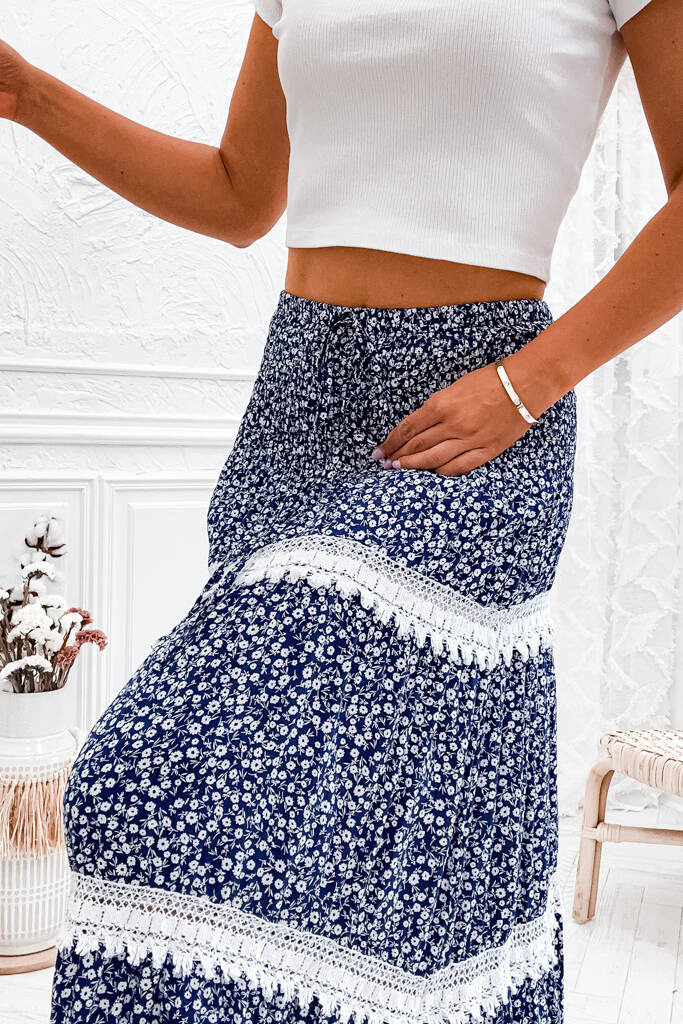 SPÓDNICA W KWIATY Z KORONKOWYMI WSTAWKAMI- GRANATOWA
