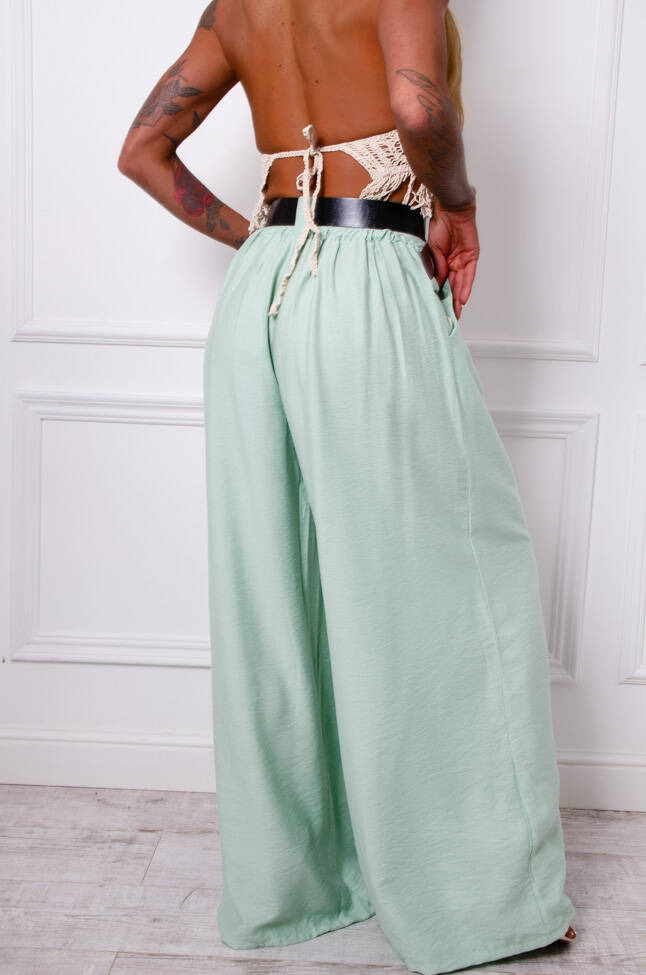 SZEROKIE SPODNIE ONE SIZE Z KIESZENIAMI I PASKIEM- JASNO ZIELONE
