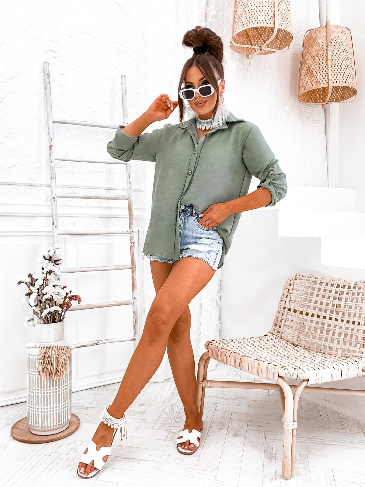LNIANA KOSZULA Z PODWIJANYM RĘKAWEM- ZIELONA