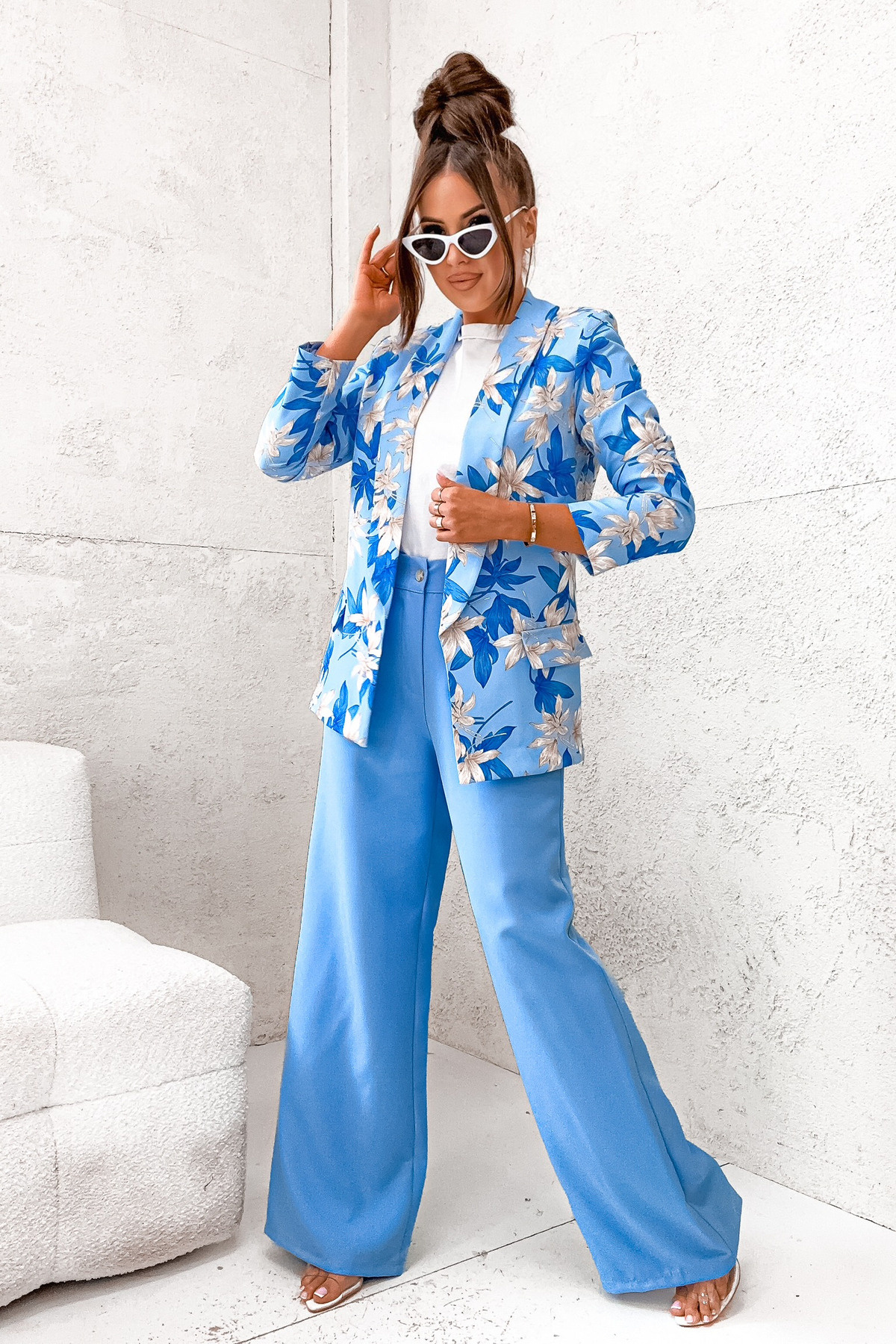 KOMPLET MARYNARKA W KWIATY + SZEROKIE SPODNIE- NIEBIESKI