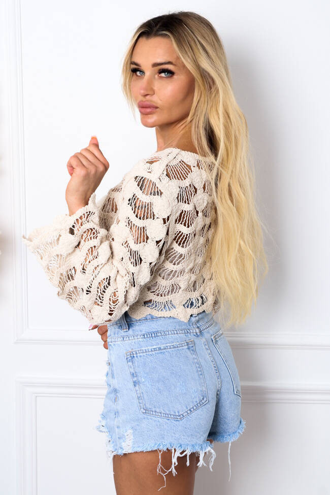 BLUZKA AŻUROWA WE WZORY Z ROZSZERZANYMI RĘKAWAMI- BEŻOWA