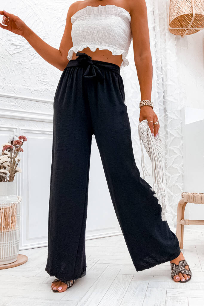 SPODNIE SZEROKIE Z GUMĄ I WIĄZANIEM W PASIE- CZARNE