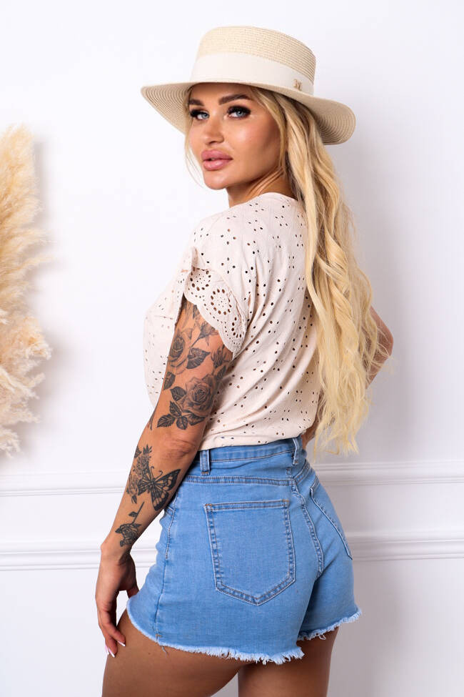 BLUZKA AŻUROWA Z FALBANKĄ NA RĘKAWIE I WIĄZANIEM- BEŻOWA