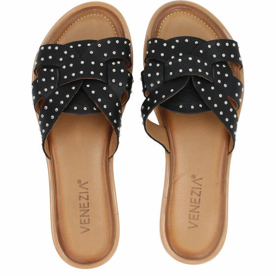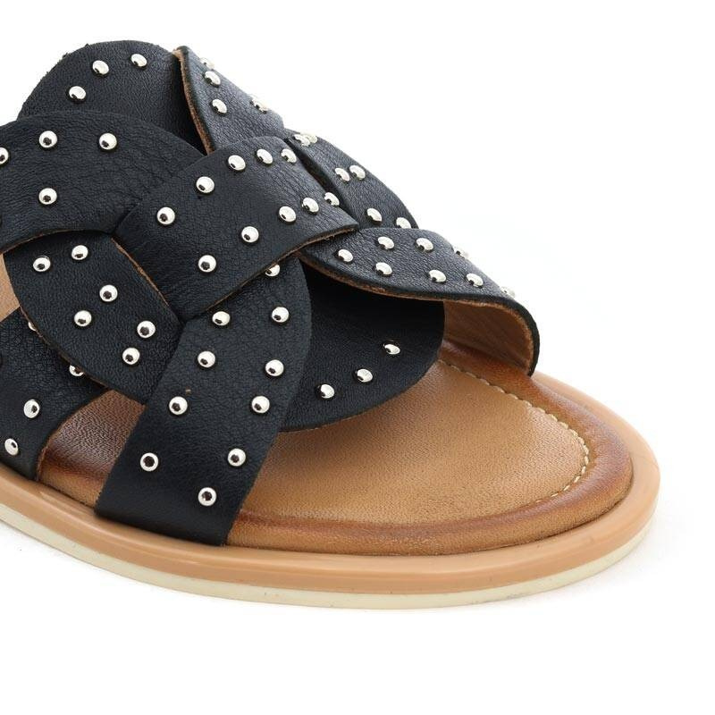 Czarne klapki damskie wykonane z miękkiej skóry naturalnej. Dekoracyjnie przeplatane paski ozdobione nitami sprawiają, że model bardzo ładnie prezentuje się na nodze. Elastyczna podeszwa razem ze skórzaną wkładką w całości podbitą miękką gąbką zapewniają maksymalny komfort dla stóp. Lekkie klapki to must have w letniej garderobie każdej kobiety.