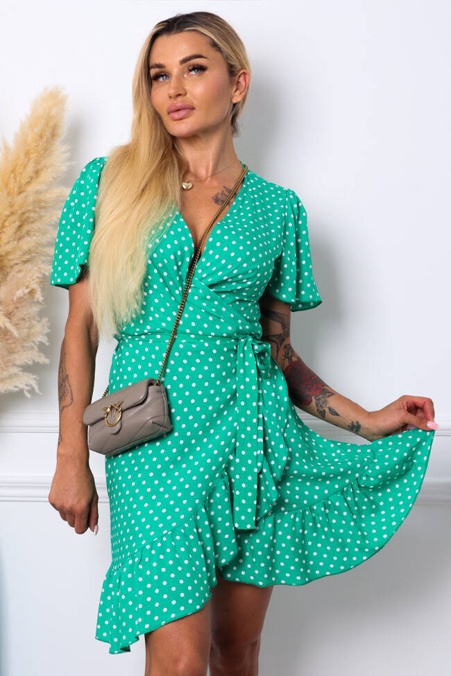 SUKIENKA KOPERTOWA W KROPKI Z PASKIEM- CIEMNO ZIELONA