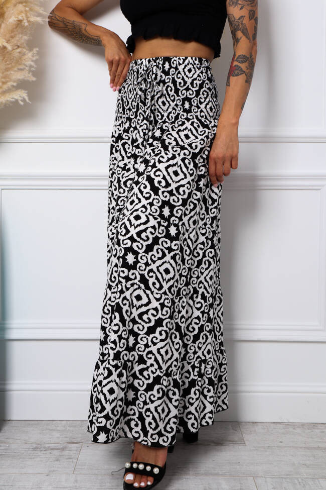 WZORZYSTA SPÓDNICA MAXI Z GUMĄ W PSIE- CZARNA