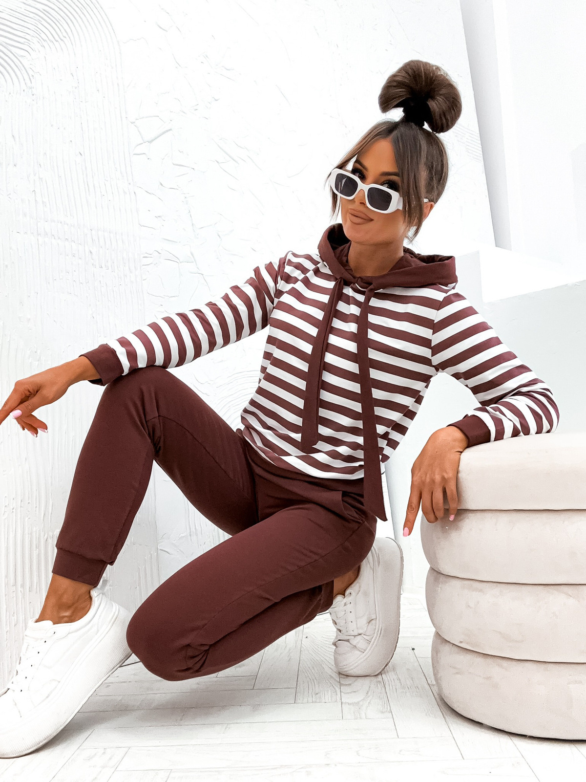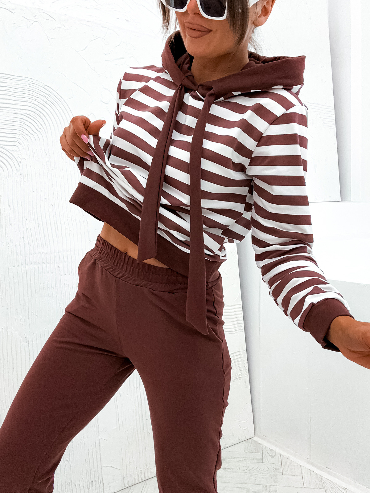 KOMPLET DRESOWY BLUZA W PASKI+ SPODNIE- CZEKOLADOWY