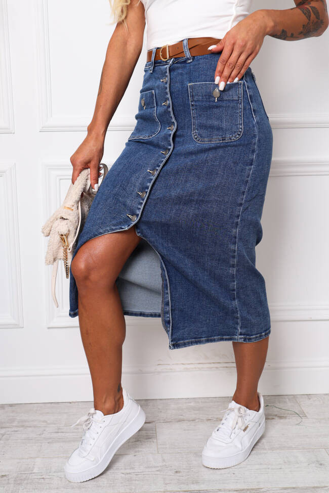 Jeansowa spódnica midi z guzikami z przodu i kieszeniami .Wysoki stan podkreśla talię,a uciągliwy jeans pięknie dopasowuje się do sylwetki Klasyka która pasuje do każdej stylizacji. Pasek gratis.