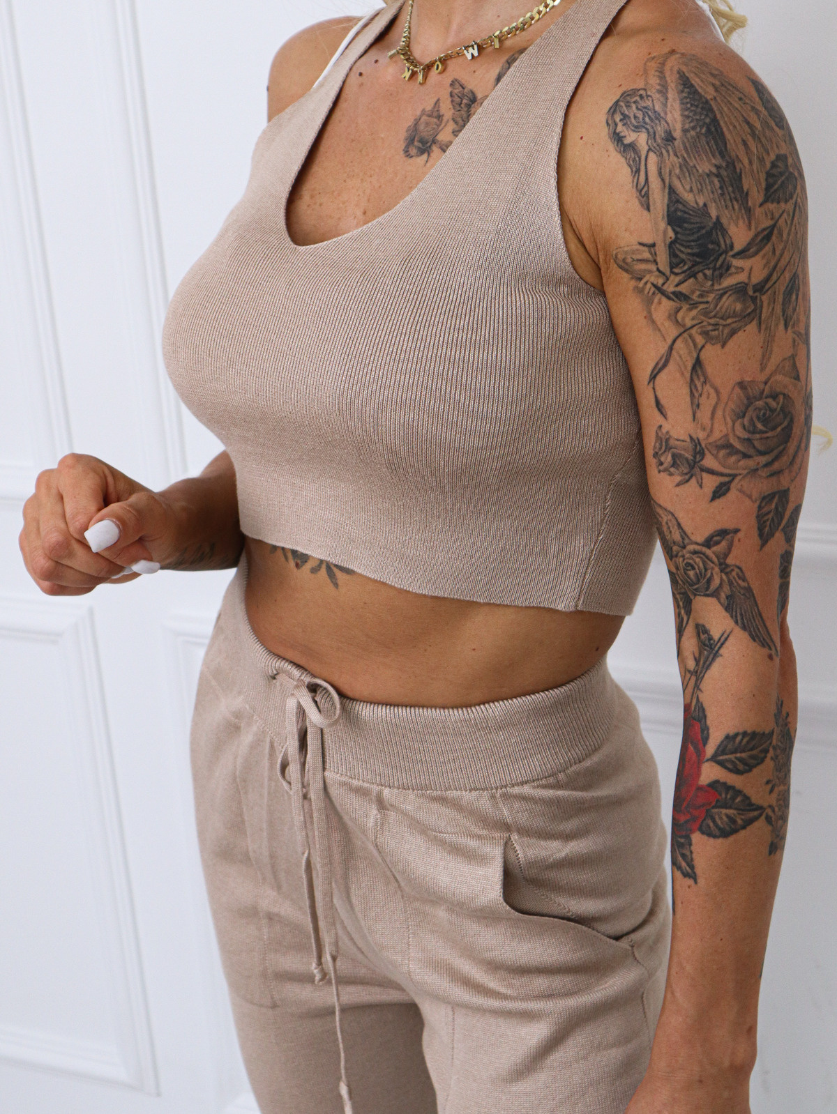 Komplet dzianinowy 3- częściowy. Krótki top na ramiączka. Spodnie ze sznurkiem w pasie i ściągaczami na nogawkach. Kardigan zapinany na guziki, posiada ściągacze przy rękawach.